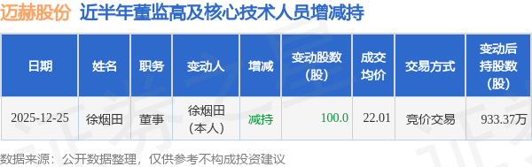 证券之星消息,根据12月26日市场公开信息、上市公司公告及交易所披露数据整理,迈赫股份(301199)最新董监高及相关人员股份变动情况:2025年12月25日公司董事徐烟田共减持公司股份100.0股,占公司总股本为0.0001%。变动期间公司股价上涨6.72%,12月25日当日收盘报23.33元。