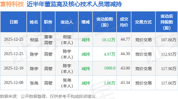 富特科技近半年内的董监高及核心技术人员增减持详情如下: