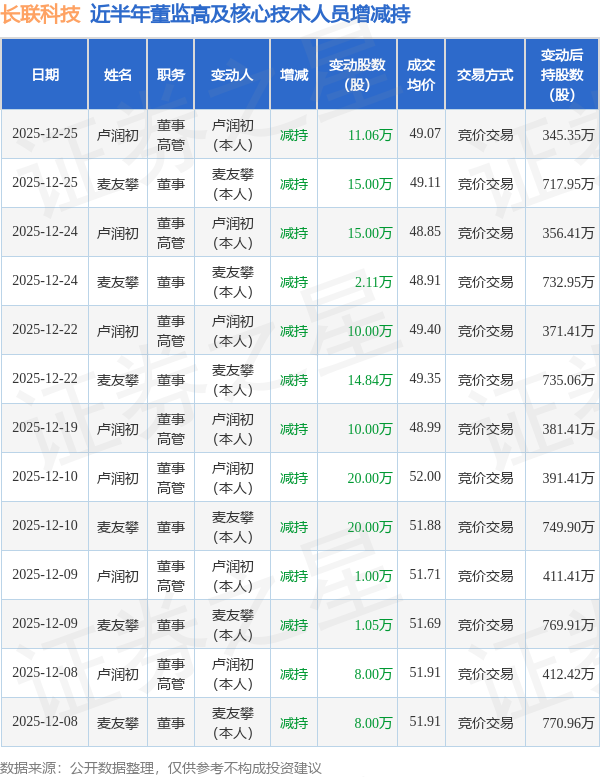 长联科技近半年内的董监高及核心技术人员增减持详情如下: