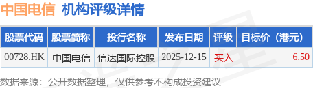 投行对该股的评级以买入为主,近90天内共有1家投行给出买入评级,近90天的目标均价为6.5港元。信达国际控股最新一份研报给予中国电信买入评级,目标价6.5港元。
