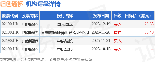 投行对该股的评级以买入为主,近90天内共有3家投行给出买入评级,近90天的目标均价为32.38港元。国元国际最新一份研报给予归创通桥买入评级,目标价28.35港元。