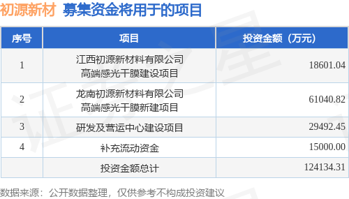 证券之星消息,湖南初源新材料股份有限公司(简称:初源新材)拟在深交所创业板上市,募资总金额为12.2亿元,保荐机构为华泰联合证券有限责任公司。募集资金拟用于江西初源新材料有限公司高端感光干膜建设项目、龙南初源新材料有限公司高端感光干膜新建项目、研发及营运中心建设项目、补充流动资金,详见下表: