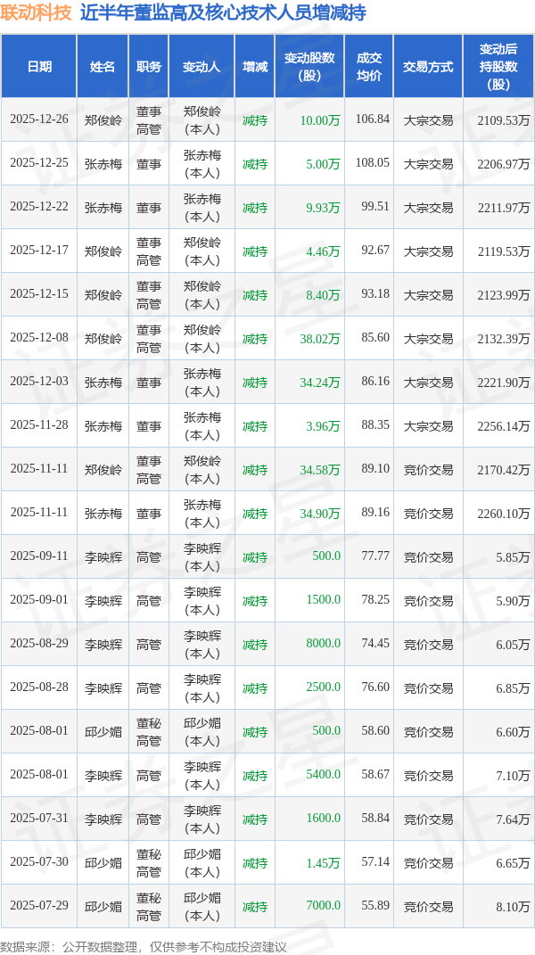 联动科技近半年内的董监高及核心技术人员增减持详情如下: