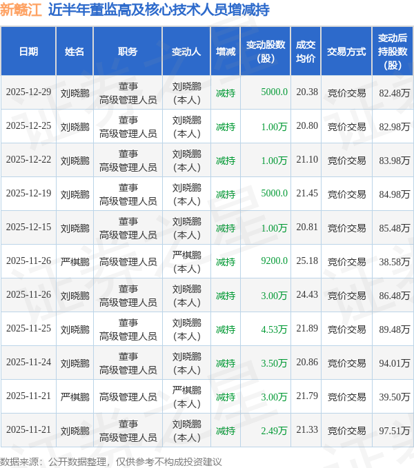 新赣江近半年内的董监高及核心技术人员增减持详情如下: