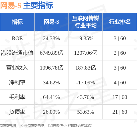 网易-S港股市值6749.89亿港元,在互联网传媒行业中排名第2。主要指标见下表: