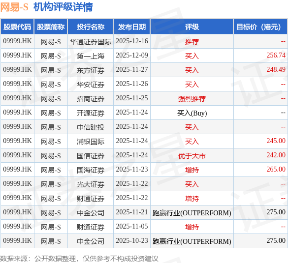 投行对该股的评级以买入为主,近90天内共有6家投行给出买入评级,近90天的目标均价为258.18港元。华通证券国际最新一份研报给予网易-S推荐评级。