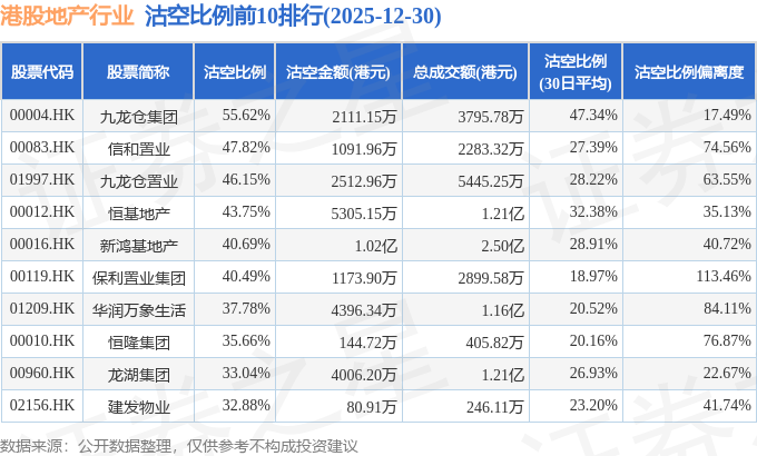 从沽空比例来看,九龙仓集团、信和置业、九龙仓置业沽空比例位居行业前三,分别为55.62%、47.82%、46.15%。