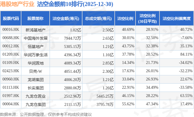 从沽空金额来看,新鸿基地产、中国海外发展、恒基地产沽空金额位居行业前三,分别为1.02亿港元、7944.72万港元、5305.15万港元。