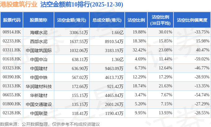从沽空金额来看,海螺水泥、西部水泥、中国建筑国际沽空金额位居行业前三,分别为3306.51万港元、1637.55万港元、1032.06万港元。