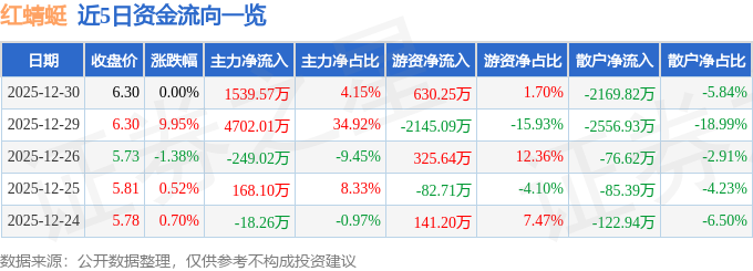 证券之星消息,截至2025年12月30日收盘,红蜻蜓(603116)报收于6.3元,上涨0.0%,换手率10.05%,成交量57.91万手,成交额3.71亿元。