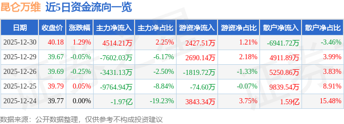 证券之星消息,截至2025年12月30日收盘,昆仑万维(300418)报收于40.18元,上涨1.29%,换手率3.95%,成交量49.55万手,成交额20.06亿元。