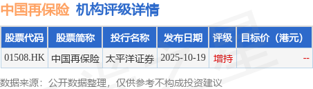 投行对该股的评级以增持为主,近90天内共有1家投行给出增持评级。太平洋证券最新一份研报给予中国再保险增持评级。