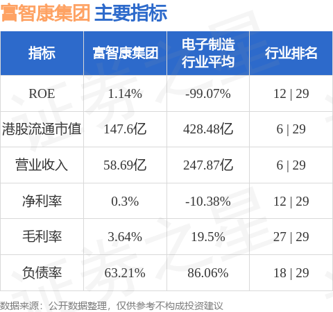 富智康集团港股市值147.6亿港元,在电子制造行业中排名第6。主要指标见下表: