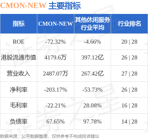 CMON-NEW港股市值4179.6万港元,在其他休闲服务行业中排名第26。主要指标见下表: