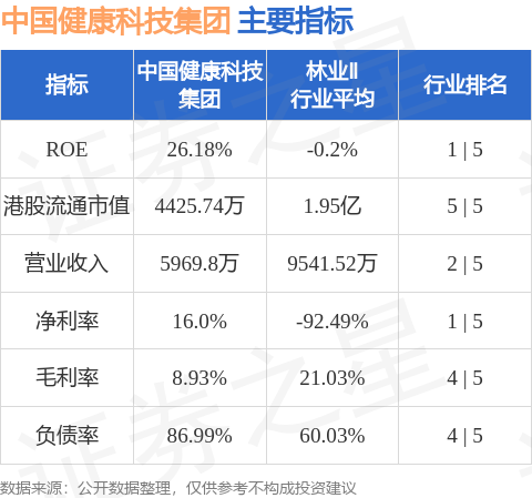 中国健康科技集团港股市值4425.74万港元,在林业Ⅱ行业中排名第5。主要指标见下表: