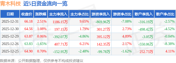 证券之星消息,截至2025年12月31日收盘,青木科技(301110)报收于66.18元,上涨2.51%,换手率2.87%,成交量1.87万手,成交额1.23亿元。