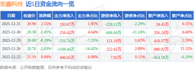 证券之星消息,截至2025年12月31日收盘,宏鑫科技(301539)报收于20.9元,上涨2.55%,换手率6.37%,成交量4.78万手,成交额9949.78万元。
