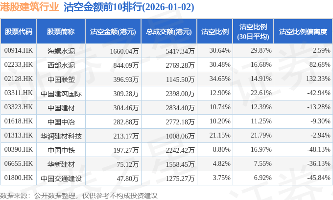 从沽空金额来看,海螺水泥、西部水泥、中国联塑沽空金额位居行业前三,分别为1660.04万港元、844.09万港元、396.93万港元。