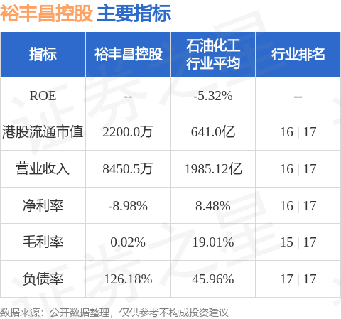 裕丰昌控股港股市值2200万港元,在石油化工行业中排名第16。主要指标见下表: