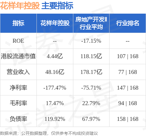 花样年控股港股市值4.44亿港元,在房地产开发Ⅱ行业中排名第107。主要指标见下表: