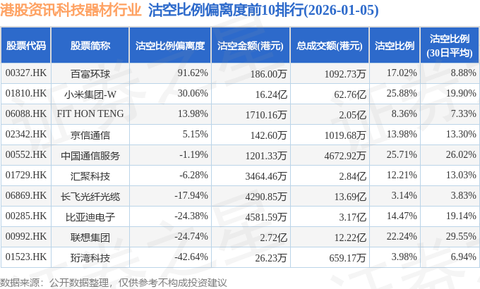 从沽空比例偏离度来看,百富环球、小米集团-W、FIT HON TENG沽空比例偏离度位居行业前三,分别为91.62%、30.06%、13.98%。
