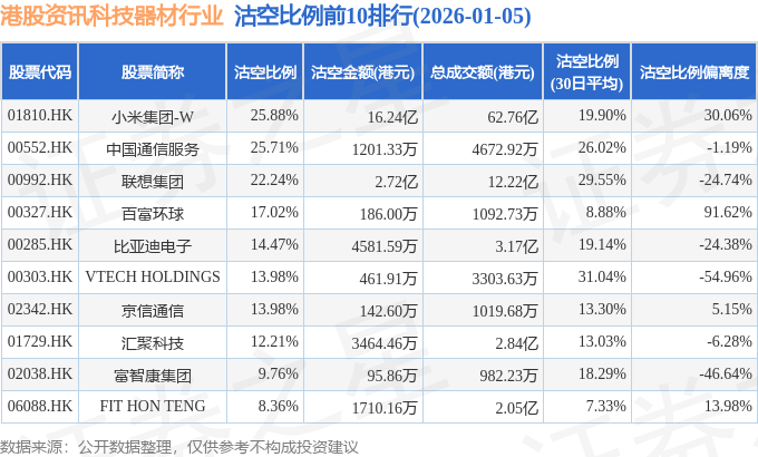 从沽空比例来看,小米集团-W、中国通信服务、联想集团沽空比例位居行业前三,分别为25.88%、25.71%、22.24%。