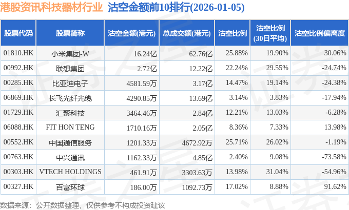 从沽空金额来看,小米集团-W、联想集团、比亚迪电子沽空金额位居行业前三,分别为16.24亿港元、2.72亿港元、4581.59万港元。