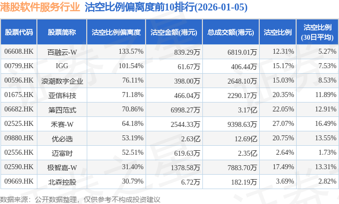 从沽空比例偏离度来看,百融云-W、IGG、浪潮数字企业沽空比例偏离度位居行业前三,分别为133.57%、101.54%、76.11%。
