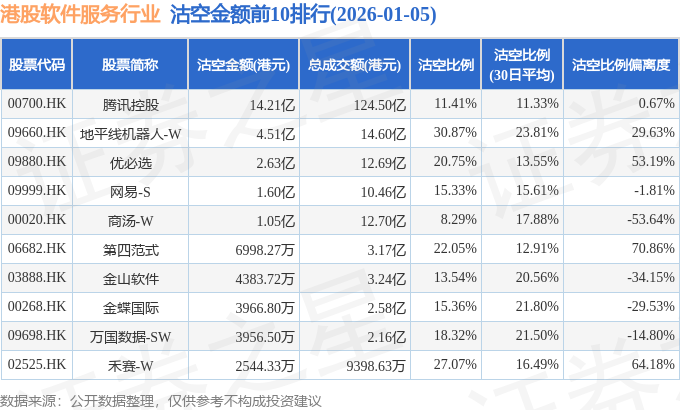 从沽空金额来看,腾讯控股、地平线机器人-W、优必选沽空金额位居行业前三,分别为14.21亿港元、4.51亿港元、2.63亿港元。