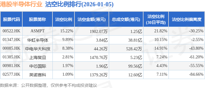 从沽空比例偏离度来看,华虹半导体、ASMPT、中电华大科技沽空比例偏离度位居行业前三,分别为-2.55%、-30.25%、-43.8%。