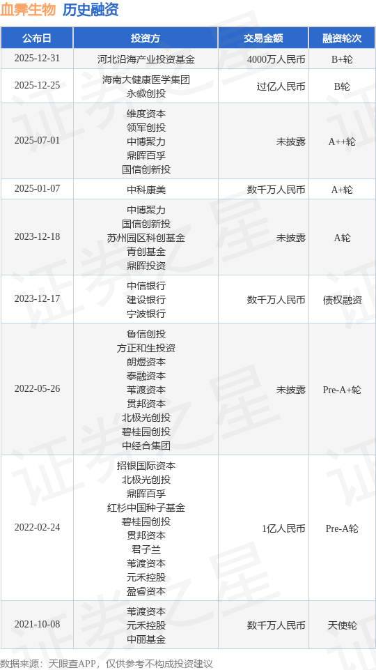 证券之星消息,根据天眼查APP于12月31日公布的信息整理,苏州血霁生物科技有限公司B+轮融资,融资额4000万人民币,参与投资的机构包括河北沿海产业投资基金。