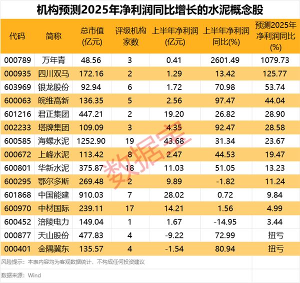 根据机构一致预测,2025全年净利润预计向好的水泥股共计15只。其中,万年青、四川双马净利润有望同比翻倍,增幅依次为1079.73%、125.77%;银龙股份、皖维高新预计净利润同比增幅为53.74%、44.04%;天山股份和金隅冀东预计全年实现扭亏为盈。