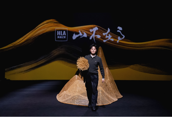 秀场中央,由非遗竹编艺术家宋亮亮为海澜之家「山不在高」量身打造的艺术装置尤为引人注目。他以极具现代感的流线型编织手法,将传统竹艺化为一座灵动的“山形”结构,在秀场空间呈现出疏密有致的东方画境。灯光穿过竹编缝隙,在秀场地面投下斑驳光影。模特们身着「山不在高」系列款款走来,与此装置遥相呼应,让古老的手工艺在当代时尚语境中焕发出全新的生命力。