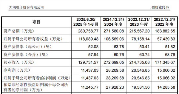 2022年至2024年及2025年上半年,大明电子的营业收入分别为17.13亿元、21.47亿元、27.27亿元及12.97亿元,归母净利润分别为1.51亿元、2.05亿元、2.82亿元及1.14亿元。