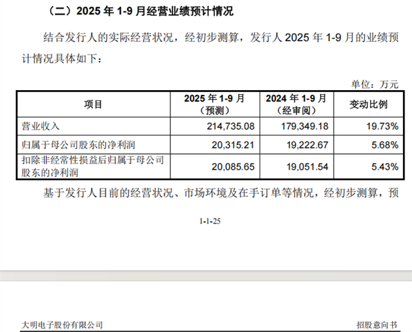 招股意向书显示,由于与客户合作稳定,业务模式成熟,大明电子预计其2025年前三季度的营业收入为21.47亿元,同比增长19.73%;归母净利润为2.03亿元,同比增长5.68%。