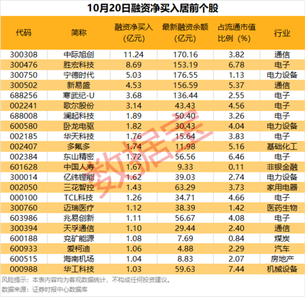 具体到个股,10月20日获融资净买入千万元以上的有386只,其中22只融资净买入额超1亿元。中际旭创融资净买入额居首,当日净买入11.24亿元;其次是胜宏科技、宁德时代,融资净买入金额分别为8.69亿元、5.03亿元;融资净买入金额居前的还有新易盛、寒武纪-U、歌尔股份等。
