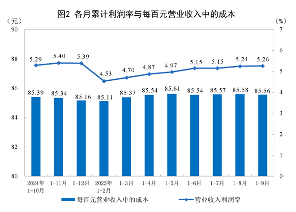 1—9月份,规模以上工业企业实现营业收入102.08万亿元,同比增长2.4%;发生营业成本87.34万亿元,增长2.6%;营业收入利润率为5.26%,同比提高0.04个百分点。