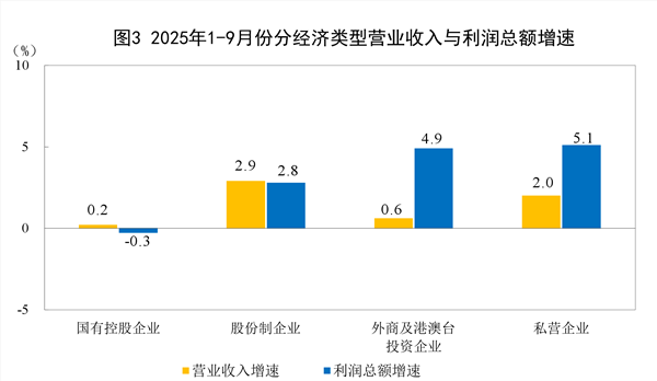 1—9月份,规模以上工业企业中,国有控股企业实现利润总额17021.8亿元,同比下降0.3%;股份制企业实现利润总额39923.5亿元,增长2.8%;外商及港澳台投资企业实现利润总额13509.7亿元,增长4.9%;私营企业实现利润总额15131.7亿元,增长5.1%。