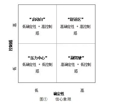 本书穿梭于资本市场的大起大落、企业的战略彷徨与人生的十字路口,旨在揭示如何在情绪与信息的洪流中保持心智的澄明。作者并未许诺一剂万能解药,而是构建出一个名为“信心象限”的思维框架,将信心解构为两个维度——确定性和控制感,并由此划分出四大区域(图①)。