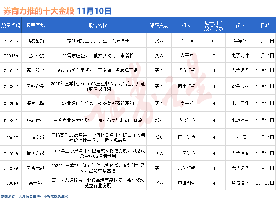 除了上述个股外,还有天味食品、深南电路、华新建材、中钨高新、横店东磁、天合光能、富士达等多股备受券商关注。