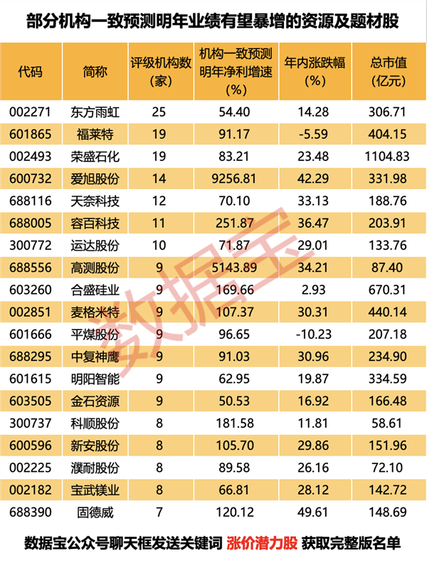 据证券时报·数据宝统计,3家以上机构评级的电力设备、有色金属、钢铁、煤炭、基础化工等行业的个股中,有51股机构一致预测明年净利增速超50%且年内涨幅低于50%。
