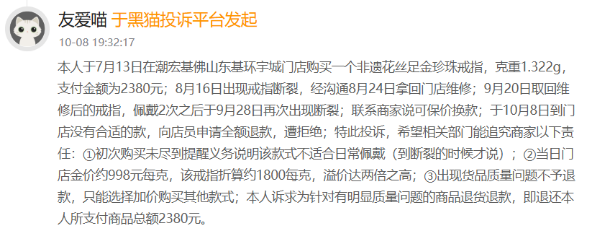 此外在产品策略层面,潮宏基在2023年推出“小克重黄金”战略,另外还推出高工费、高附加值的黄金产品;一口价黄金产品等。这一套高溢价产品组合拳,一定程度推动公司传统黄金产品的收入上升。然而,高工费、一口价的定价逻辑虽能提升单品毛利率,但若产品实际价值与高溢价未能形成强匹配,也易引发客户信任危机。前述风险在消费端已显现,证券之星翻阅黑猫投诉平台发现,部分消费者反馈其购买的潮宏基珠宝产品存在质量相关问题,此类消费诉求若处理不当,易致使公司品牌口碑损耗。