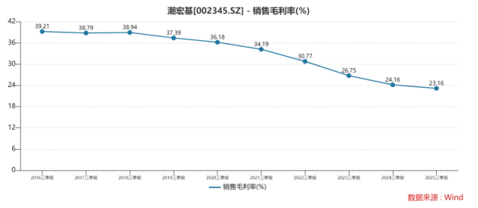 由于毛利率较低的黄金产品在加盟体系中占比提升,该渠道的整体毛利率被直接拖累,从2022年的22.6%降至2024年的16.6%,并在今年上半年维持在16.6%,低于同期自营及线上渠道。截至今年前三季度,公司毛利率为23.16%,已连续七个季度出现同期下滑。