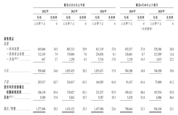 不过,传统黄金产品的溢价能力较弱,2022年至2024年,潮宏基经典黄金珠宝的毛利率均未突破10%,即便今年上半年受益于金价的上涨,该产品的毛利率提升至11.8%,也远低于同期时尚珠宝26.8%的水平。