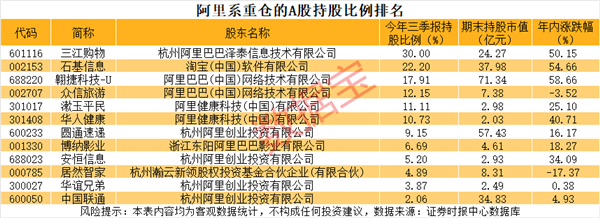 值得一提的是,阿里系直接间接参股了部分A股公司,未来能否沾光值得关注。据数据宝统计,阿里、淘宝等阿里系直接或间接参股了10多家A股公司,其中持股比例较高的三江购物、石基信息、翱捷科技-U、众信旅游等,占流通股比例均超过10%。