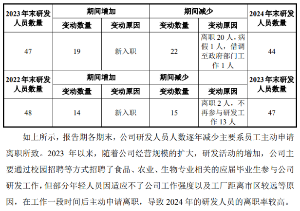 而研发人员频繁变动更增添了对研发活动持续性的疑虑。首轮问询回复显示,2023年公司有13人不再从事研发工作,2人离职,另新招14人从事研发工作;2024年,公司研发人员新入职19人、离职20人,几乎全员换血。如此高流动性下,研发项目的延续性和深度如何保证,成为监管关注的问题。