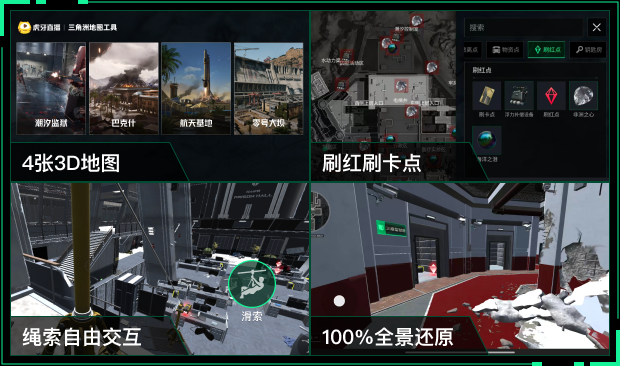 虎牙三角洲地图工具以100%全3D复刻游戏实景为基础,将监狱、巴克什、航天基地等核心地图完整呈现。无论是细微的楼梯台阶、滑索装置,还是宏观的建筑布局、地形起伏,均与游戏内场景保持高度一致。这一特性让玩家能够在无战斗压力的环境中自由探索地图每一处角落,隐蔽通道、屋顶平台等关键位置可提前熟悉,彻底告别“落地迷路”的困扰。