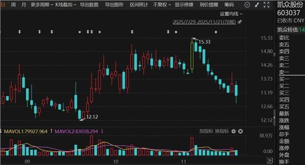 2025年前三季度,凯众股份实现营收5.64亿元,净利润5829万元。截至11月21日收盘,凯众股份股价13.08元/股,总市值35.06亿元。