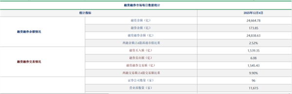 不过,中证数据有限责任公司最新动态数据显示,进入12月后两融余额已有回稳迹象。截至12月4日,A股融资余额为24838.63亿元,较11末略有回升;当前两融余额占A股流通市值比例为2.52%,整体杠杆水平仍处于稳健区间。