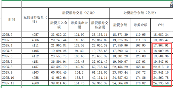 值得留意的是,今年4月至10月期间,两融余额曾连续七个月保持增长,从4月末的17864.91亿元一路攀升至10月末的24862.78亿元。11月的小幅回调,是半年以来首次月度下降。